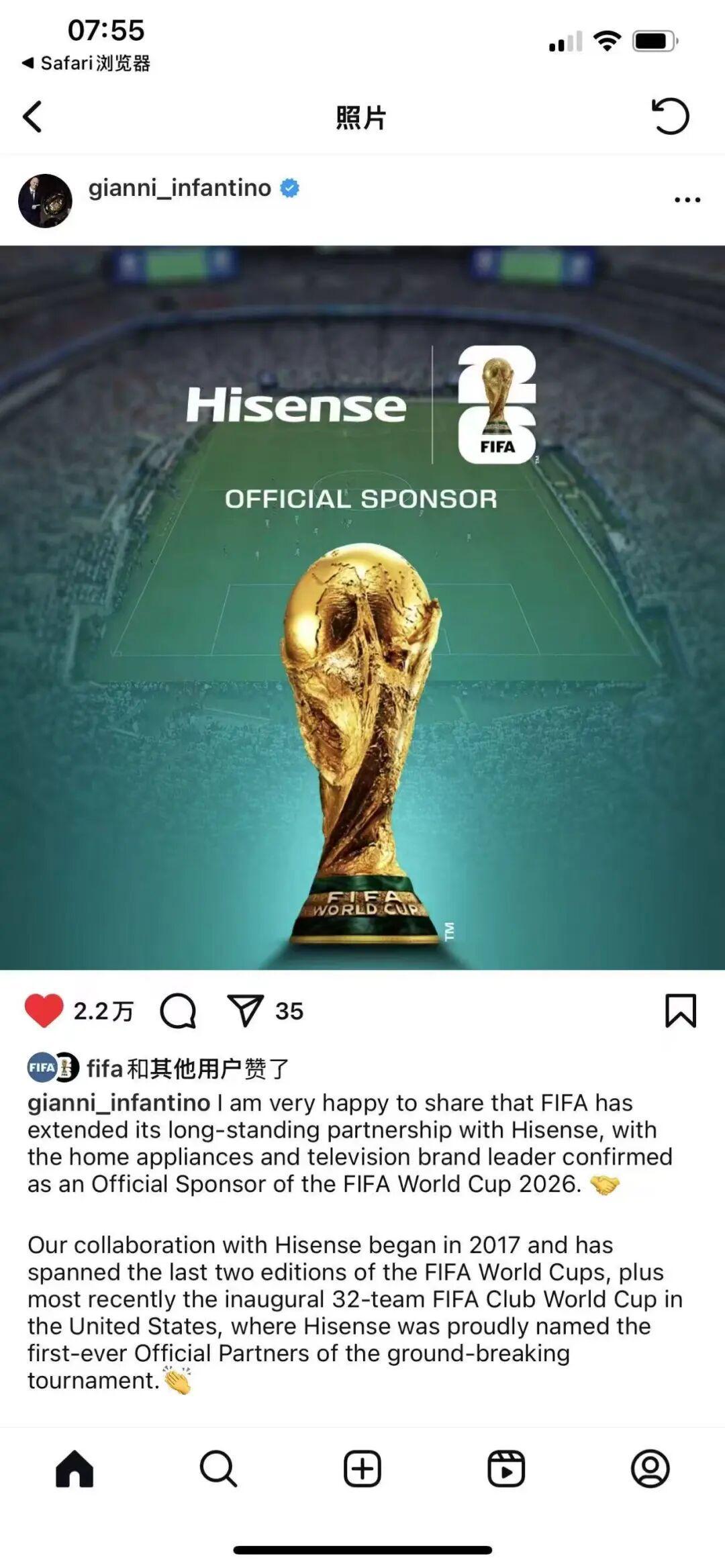 对于海信与国际足联的长期深度合作,国际足联主席詹尼·因凡蒂诺也在个人社交平台上拍手称赞。