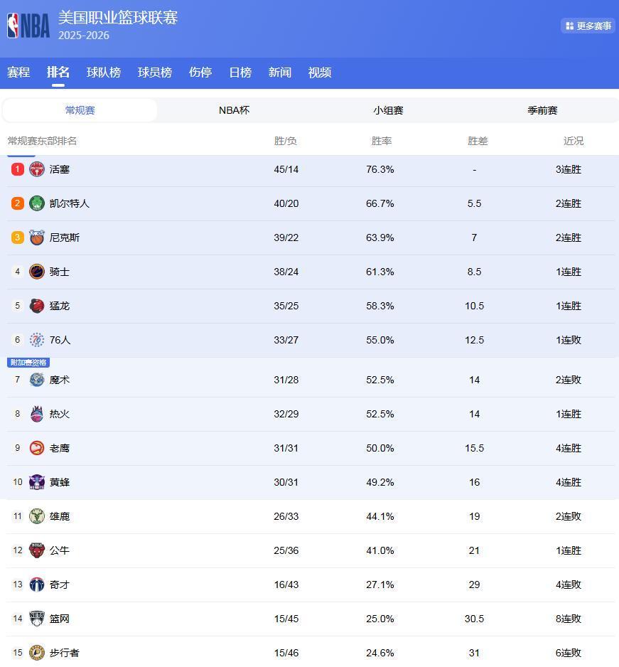 东部最新排名: