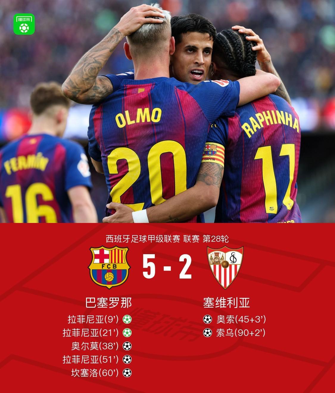 北京时间3月15日西班牙足球甲级联赛 联赛 第28轮,巴塞罗那主场对阵塞维利亚。上半场坎塞洛造点,拉菲尼亚打进勺子点球,之后坎塞洛造手球,拉菲尼亚点球双响,随后贝尔纳尔传球发生折射,奥尔莫破门,半场补时阶段奥索破门扳回一球。下半场拉菲尼亚折射破门上演帽子戏法,之后坎塞洛长驱直入扣过防守后破门斩获回归后首球,补时阶段奥索传中,索乌头球破门扳回一球。最终巴萨5-2战胜塞维利亚。